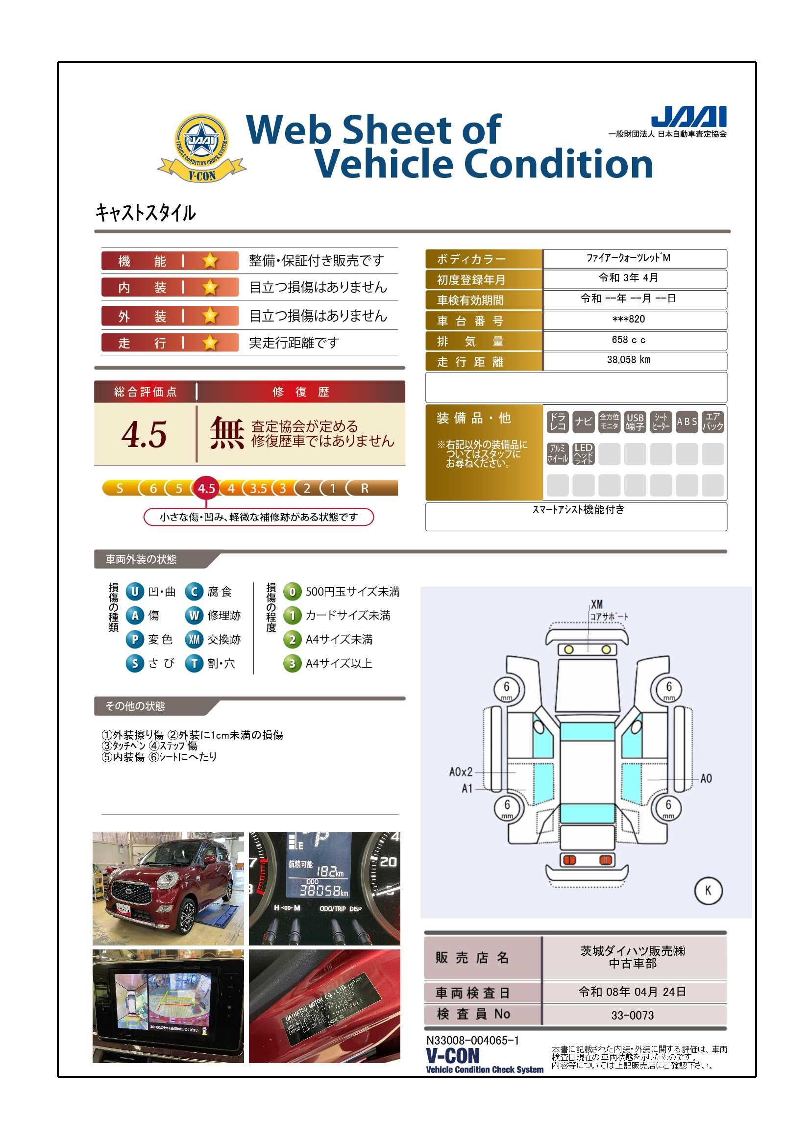 現状の車両の状態に関しましては必ず販売店に確認をお願いします。(2008年10月からの評価基準改定により、一部の車両につき店頭の評価表記と違う場合がございます。詳しくは販売店にお問い合わせください。
